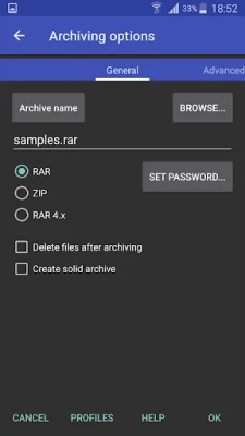 RAR can create RAR and ZIP and unpack RAR, ZIP, TAR, GZ, BZ2, XZ, 7z, ISO, ARJ archives. List of functions include repair command for damaged ZIP and RAR files, benchmark function compatible with RARLAB's WinRAR benchmark, recovery record, usual and recovery volumes, encryption, solid archives, utilizing multiple CPU cores to compress data.